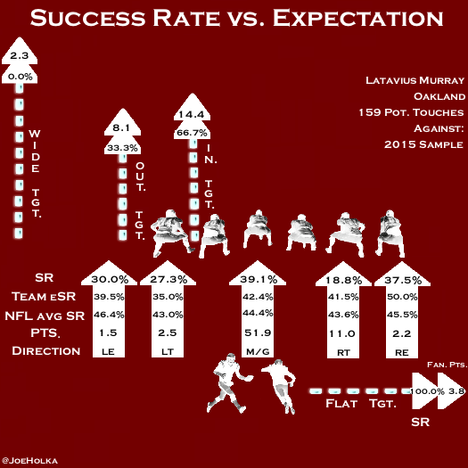 The overall eSR for Murray and the Raiders was 41.9% per rushing attempt, 19th in the NFL but below the NFL average of 44.3%.