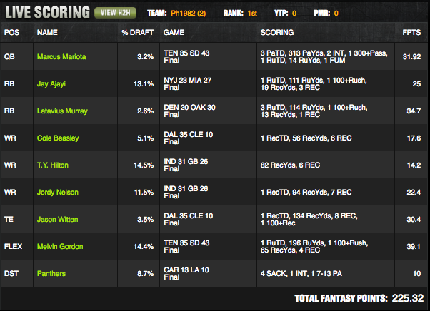 One final note: T.Y. Hilton and Jordy Nelson are an example of a correlated passing game stack, which was craftily used without one of their expensive QBs in order to save salary.