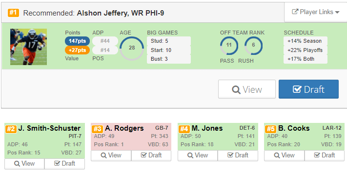 While this league doesn’t implement a flex spot, there are three wide receiver spots to fill and Draft Hero is pushing for a quality receiver here before waiting for 18 picks until it gets back to the turn.