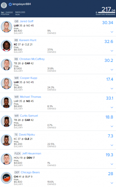 Like the winning DraftKings lineup, kingslayer884 used a pair of punt plays to pay up for five studs, including the defense, but this lineup used a tight end in the flex. This is the first time in 2018 that the winning Sunday Million lineup didn’t use a third running back, but it was a much-needed differentiator with four players owned in over 20 percent of lineups and a defense that was one of the most popular of the season.