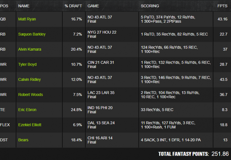 dacoltz was slightly more aggressive with his ATL/NO game stack compared to DraftKings’ million dollar winner, adding Julio Jones to the mix. While Julio put up mediocre results, this lineup is a reminder that zeroing in on the right game can take down a major tournament even if one of those players underperforms. Having some exposure to the high-powered Chiefs offense remained a must and with heavy ownership on Eric Ebron and similar price points for Travis Kelce and Zach Ertz, Kelce’s ownership stayed in check.
