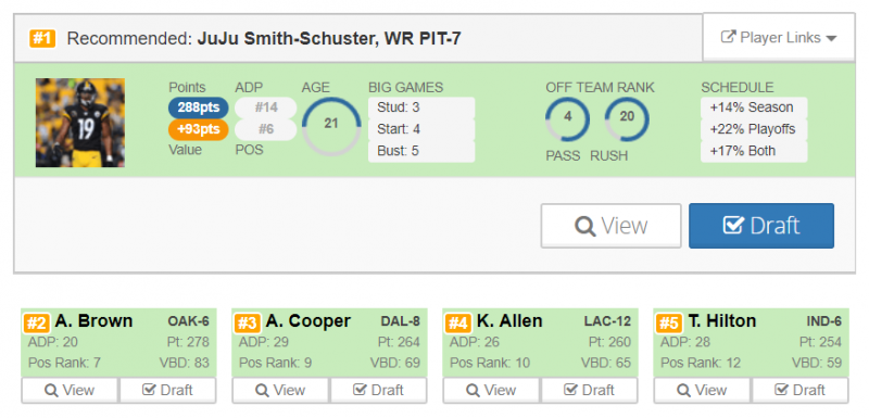 Zero RB: As I mentioned above, I’m going zero running back in the first two rounds. When picking at the back end of the draft, I’m committing to WR-TE for my first two picks, and I’ve set Draft Hero as such. I allowed Draft Hero to recommend two receivers, just in case all the top-three tight ends are gone, but if one of them is there, I like locking up the position at the 12/13 turn.