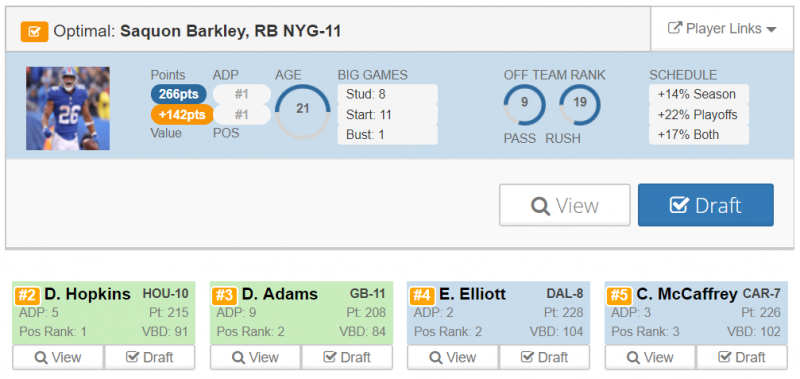 I don’t try to win my league in the first round, I just try not to lose it. Getting the best player in fantasy football in the first round is certainly what you’re hoping for, but the key to winning your league is to get quality production from the stars you select early, while capitalizing on value and upside late. When I have the first pick overall, what I really want is a player I trust. I go with someone who I think has the least amount of risk. This year, the safest option I see is Barkley.