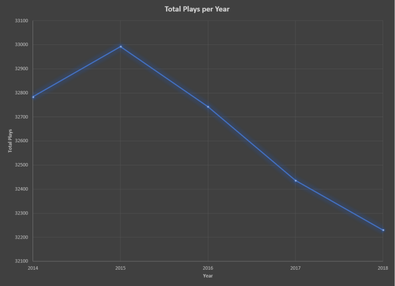 Despite a consistent decrease in total play volume, teams scored more points during the 2018 season—on fewer plays(!)—than they have over the past five years.