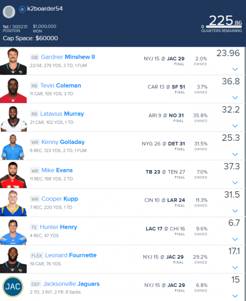 This week’s Sunday Million winner implemented the untraditional QB/RB/DEF stack to help offset a relatively chalky lineup. By rostering a quarterback with his running back, you give yourself a chance to corner almost all of one offense’s production and this tactic works especially well when a team has a somewhat diluted target share. Going into the week, four Jaguars had seen at least 15% of the team targets, making it worth the risk to start Gardner Minshew without one of his primary receivers. While Minshew didn’t have a monster game, he finished as the QB6, less than five points behind the week’s QB1. Because fantasy scoring is usually quite flat at the quarterback position, it often pays to be contrarian there.