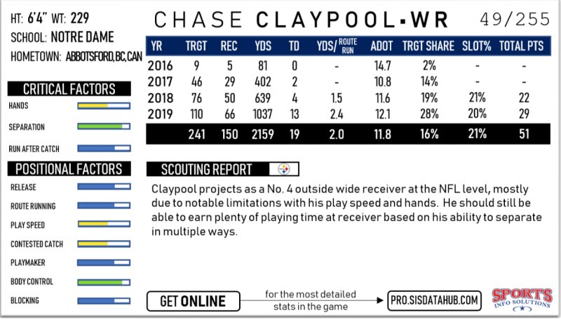 The Steelers have always been willing to invest Day 2 picks into wide receivers with current players JuJu Smith-Schuster (2017), James Washington (2018), and Diontae Johnson (2019) all representing past selections during that time, making this the fourth-straight year they chose a wide receiver before Round 4. All remain with the team and have had varying levels of success over the past few years, making Claypool’s fit from an opportunity perspective difficult to project. The 2019 target share for the Steelers has a lot of caveats.