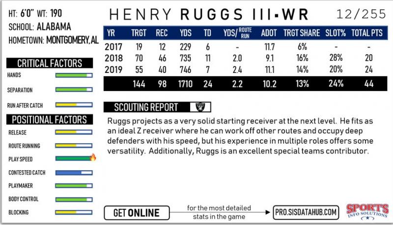 The selection of Ruggs does give the Raiders the explosive player they desired a season ago when the team traded for unhinged receiver Antonio Brown only to release him before he ever played a game for the franchise. Ruggs is the type of receiver Al Davis, principal owner and general manager of the Raiders for 39 years, would have craved. Do you remember when he drafted receiver Darrius Heyward-Bey with the seventh pick in the 2009 draft? This decision was ridiculed by everyone. The good news is that Ruggs is more than just a 40 time. This article will discuss his collegiate statistical body of work and fantasy outlook in Las Vegas.