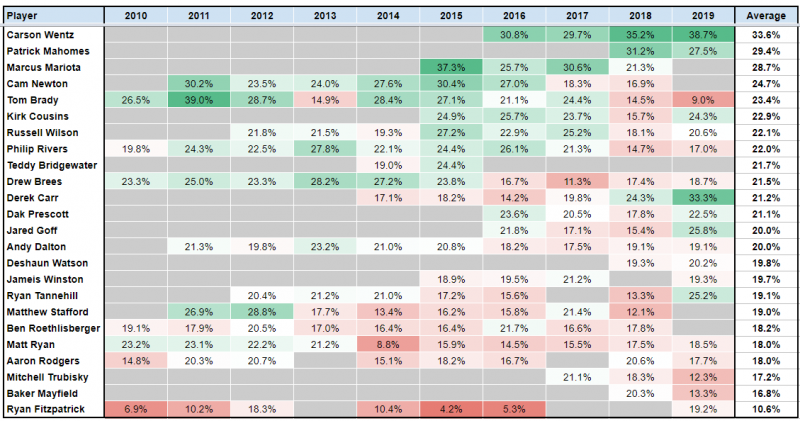 If you are open, then Brady will feed you a steady dose of accurate passes. Over the last three seasons, he’s averaged a true passer rating of 99. This quarterback rating factors out unpressured throwaways and dropped passes. Brady also has a prolific history when compared to other quarterbacks of targeting his tight ends. Here is a chart courtesy of our very own TJ Hernandez that visualizes team tight end target share for active QBs (minimum 1,000 career attempts, 10 starts to qualify in a season).