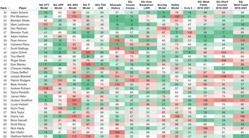 Before we get to the final model, here’s one last piece of advice. Never blindly follow anyone’s model or predictions. Learn how to do your own research and get to know the players and their tendencies as much as possible. Have the confidence to make your own adjustments. Let me give you a perfect example of this. Last week, at the Palmetto Championship, Doc Redman finished 55th in my model. Keep in mind that this tournament had an extremely weak player field. Just months ago, Doc Redman was one of the up-and-coming stars on Tour. He was also playing in his home state and had made the cut in his three previous tournaments. So even though the model didn’t like Redman’s chances of competing last week, common sense told me that these other intangibles made him worth a play. He ended up finishing second in the tournament and being a very productive selection.