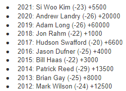 As for the golfers, it is a fairly solid field with an average strength of field rating of 324. The two headliners are Jon Rahm (+500) and Patrick Cantlay (+900), who are favored by leaps and bounds compared to their fellow competitors. Sungjae Im, Talor Gooch and Tony Finau, among others, will try to keep pace and look to be strong bets to contend here as well.