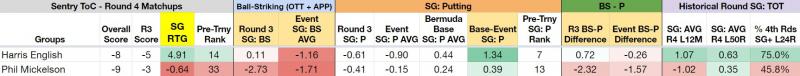 With much success, we picked on Phil Mickelson in yesterday's betting selections. Much of the same holds true in this matchup versus Harris English. After a slow start in round one, Harris English has gone 10-under in his last 35 holes with only one bogey. Last year's winner at this event, his ball-striking has progressively improved each round. If he had putted at his average Bermuda baseline he would be four shots better at 12-under right now. He has also become a very consistent Sunday performer, gaining strokes in 75% of his last 24 rounds on Sunday. Mickelson has been deep in the negative in each of the Strokes Gained categories except around the green play. He had his worst ball-striking day on Saturday, losing over 2.7 shots to the field. In contrast to English, he has struggled down the stretch of tournaments by losing strokes in 55% of his last 24 rounds on Sunday. With the Plantation Course at Kapalua being such a beatdown to walk, the effects of four days of climbing up and down the elevation changes will only be magnified all the more in the 51-year-old Mickelson's body.