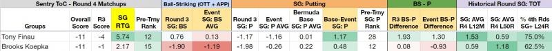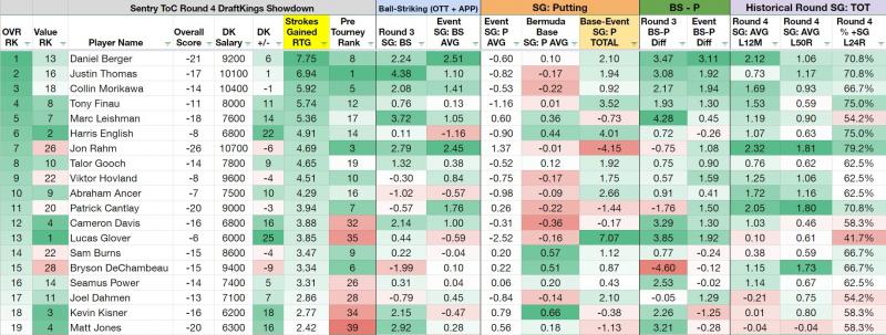 Round four of Showdown is somewhat unique compared to the other three rounds. Not only do we have three full rounds of data to analyze, but the scoring system adds in finishing points that will affect our strategy in evaluating golfers for our lineup. Below is the amount of points that get added to each finishing position: