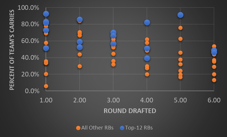 Running backs drafted in the first six rounds over the last two years have averaged a 66.7% share of their team’s carries.