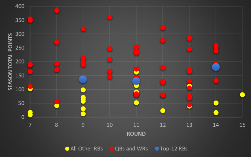 Try and capture ‘injury upside’ in the late rounds. Otherwise, look for the 1B or ancillary back that has a role in the passing game and plays in the red zone.