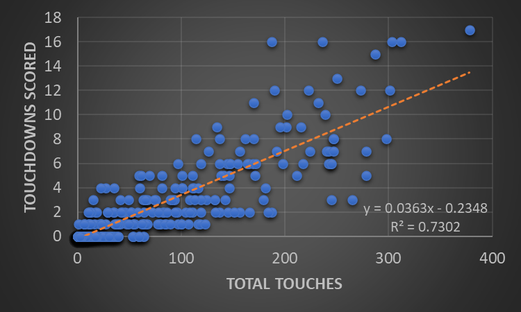 I used just two years’ worth of data, but we can see that total attempts correlates with scoring. Simply put, more carries eventually lead to more touchdowns. So, at the very least, we’d expect our early-round backs to tote the rock on a majority of their team’s snaps. Recent history would agree.