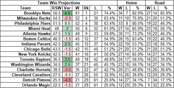Luka Doncic is the favorite to win the MVP and might just be so good that Dallas wins a ton of games and locks in a home playoff series, if not two. While that is possible, there is also a scenario in which Jason Kidd hasn’t been lying to us and really does make this team shot fewer three-pointers and get the ball to Kristaps Porzingis in the post more often. I’m not saying that’s the least optimal strategy, but it’s not much better than trying Doncic off the bench. Oh, and what if he gets injured for even a few weeks? Things could get ugly for this team. My projection does like the under for the RSW total, but I think there’s much more value in a few other markets. First, you should play Dallas over 4.5 seed (-130 at DraftKings) and also play them to miss the playoffs (+450). Doncic might be good enough to get this team to 49 wins, but if things go poorly, it’s likely to be very bad.