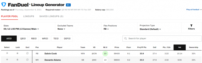 With all the cheap receiver options on DraftKings, we have the flexibility to lock in a third bellcow alongside McCaffrey and Robinson. Dropping down from Allen to Hurts at QB opens enough salary to plug in the aforementioned Najee Harris ($6,300) or Joe Mixon ($6,200). I have Adams as a lock play but another option is to move off of him and jam in Alvin Kamara ($8,600) or Dalvin Cook ($9,100). Kamara should be the undisputed focal point of the Saints offense after the release of Latavius Murray and Cook has the second-best possible matchup for a rusher.