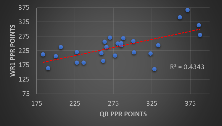 To measure correlation, I compared PPR point totals from Weeks 1 to 16 over the last two seasons between quarterbacks and the other skill positions. For wide receivers specifically, I separated wide receivers by target share:
