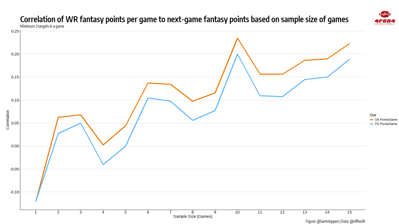 Because of that variance, it can be difficult to decide if a wide receiver’s recent performance is signal or noise. In order to get a clearer idea of how a receiver’s past fantasy scoring can predict future success, we looked at fantasy points for every wide receiver game over the last three seasons and the relationship between their performance in one game to their per-game average for every possible sample size (1 game to 15 games) before that game.