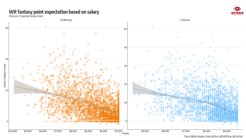Over the last two seasons, wide receiver salary has had a 0.55 correlation to fantasy scoring on DraftKings and 0.49 on FanDuel, the second strongest relationship of any position on both sites. This might be surprising since wide receiver is such a high-variance position but we must remember that these correlations include a lot of low-salary receivers that score almost no points. When we extract only fantasy-relevant receivers—players projected for at least five fantasy points—the correlation drops to about 0.35 for both sites.