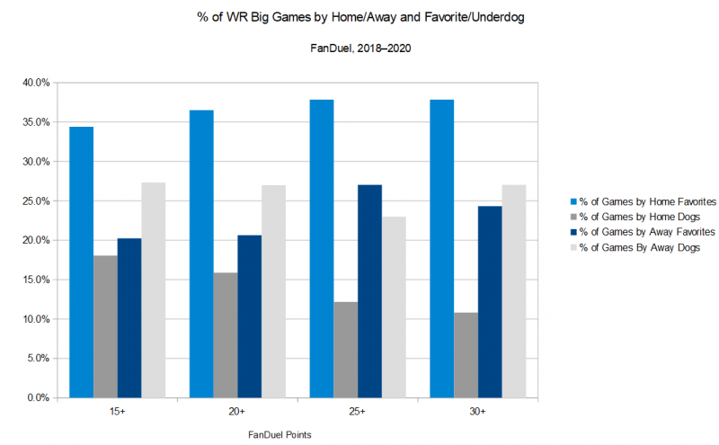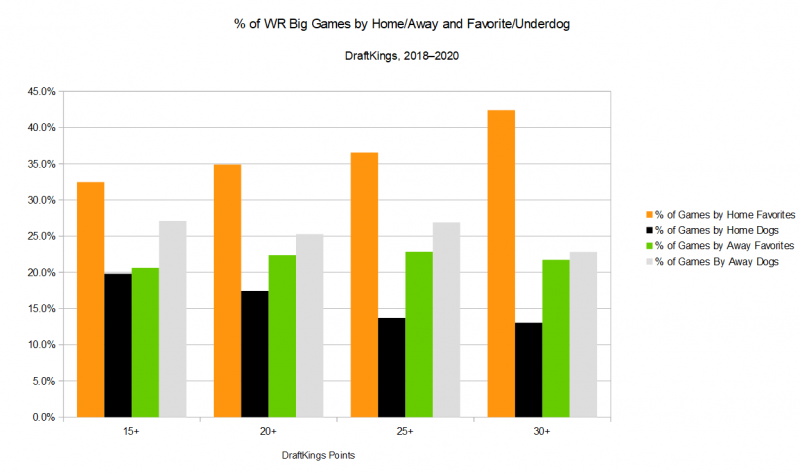 - Betting odds show little correlation to wide receiver scoring overall, but that doesn’t mean they aren’t useful. Big games are most likely to come from receivers that are home favorites. Since opposing passing games correlate, road underdogs have typically offered some upside in terms of wide receiver fantasy scoring.