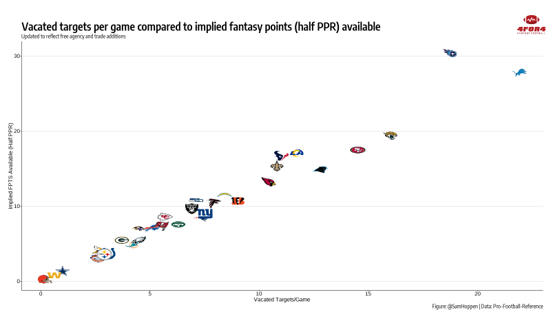 | Team | Vacated Tgts/G | Vacated Tgts % | Key Additions | Implied FP (Half-PPR) |