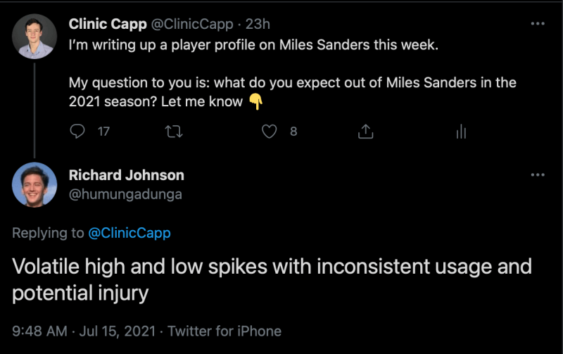 Going into the 2021 season, there are reasons to believe in Sanders again as a viable fantasy RB1. The return of a healthy O-Line, improved offensive weapons and namely, Jalen Hurts, shows good things are to come this year for Sanders's fantasy prospects. A popular narrative regarding Hurts and Sanders is that Hurts will take away from Sanders's fantasy value this year. This couldn't be further from the truth. Sanders's per-game averages across the three games he started with Jalen Hurts were: 78.6 rushing yards, 1 rushing TD, 3 receptions and 24.66 receiving yards. These numbers in terms of fantasy points averaged out to 17.82 points-per-game in half-PPR leagues, which would have been a better per-game average than the following running backs in 2020: David Montgomery, Aaron Jones, Jonathan Taylor, James Robinson, Josh Jacobs, Nick Chubb, Kareem Hunt, Ezekiel Elliot. The list goes on, but I think you get the point.