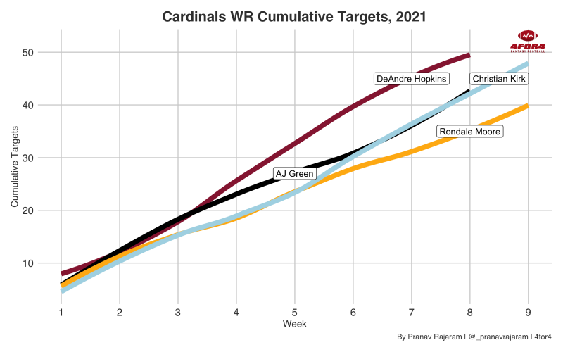 Here, we can see how Moore has lagged behind the crowded Cardinals WR room in targets, reinforcing how he likely will not see the volume needed to be a reliable fantasy option.