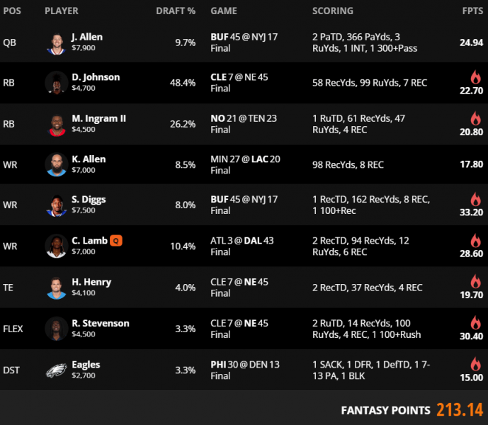 Even with the chalk Allen/Diggs stack, this was by far the most contrarian lineup to win the Sunday Million this year, carrying an average ownership of just 6.3%. The running back mini-correlation remains ever-present in winning Sunday Million lineups, now showing up on all 10 winning rosters.