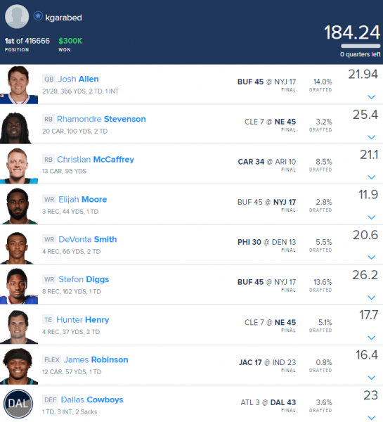 One way that this week’s winner did that was by playing the running back opposite of Johnson, rostering Rhamondre Stevenson after he was announced as active while also adding a tight end to the secondary correlation. Using Stevenson differentiated the lineup by using a third low-salary running back while most lineups were using Johnson and Ingram’s low salaries to pay up for another running back. Over half of the Millionaire field used three running backs, a huge percentage considering that the field usually flexes a running back about 30% of the time.