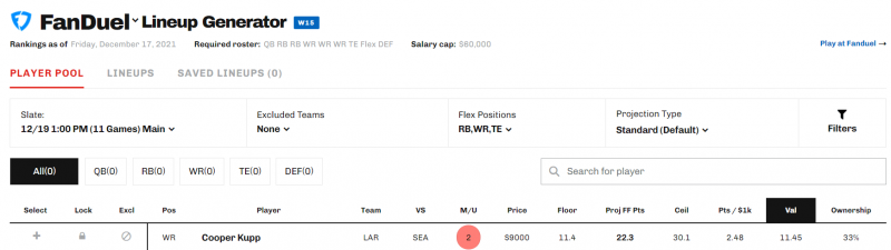 In this article, we walk through the process of constructing an optimal lineup that will dominate your cash games on the main slate of Week 15. We start with the optimal lineups for FanDuel and DraftKings determined by the Lineup Generator. Then, we identify the players that are irreplaceable and should be locked into your lineup. For the remaining players, we discuss the main alternatives that you can swap in to make a winning team that best fits your own style.
