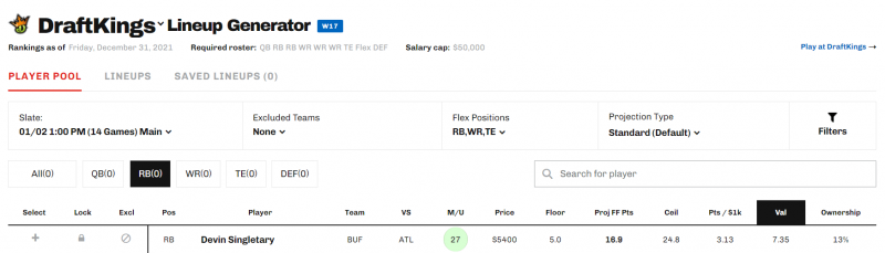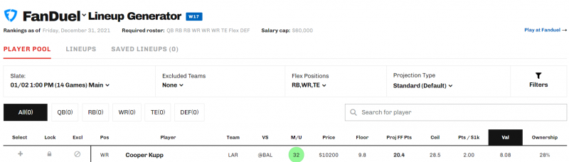 In this article, we walk through the process of constructing an optimal lineup that will dominate your cash games on the main slate of Week 17. We start with the optimal lineups for FanDuel and DraftKings determined by the Lineup Generator. Then, we identify the players that are irreplaceable and should be locked into your lineup. For the remaining players, we discuss the main alternatives that you can swap in to make a winning team that best fits your own style.