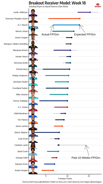 The Breakout Receiver Model returns for the final week of the regular season, and we’re going out with a bang, as the model posted one of its best weeks of the entire season in Week 17. 45% of all listed players met or exceeded expectations, and listed player scores were, on average, within 10% of expectations. The model clearly isn’t hampered by late-season playing time and personnel changes, an impressive feat within itself. With this being the last breakout receiver article of the season, let’s touch on some hits and misses from last week, hand out a few season’s end superlatives, and then dig into the week ahead.