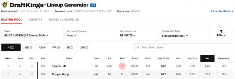Similar to Metcalf, Stefon Diggs ($7,700) has been fed targets but he's yet to have a monster game. However, the floor is steady as he's totaled 22 targets and had at least 60 receiving yards in back-to-back games. Our top pay-down option is Mike Williams ($6,000). He also has received 22 targets but he's averaging over 85 yards per game and has scored twice. An interesting contrarian option in this same price range is Robert Woods ($6,100). The Rams offense is top 10 in passing touchdowns and passing yards. Cooper Kupp is getting all the love but Woods did just receive nine targets and played 98% of the snaps.