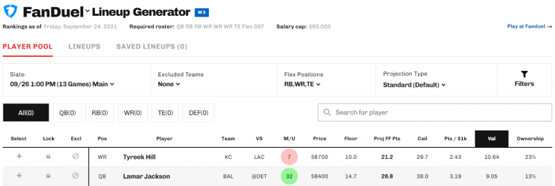 UPDATE: Dalvin Cook looks like he's going to sit out. Our optimizer recommends paying down at running back with Clyde Edwards Helaire ($4,800) and Leonard Fournette ($5,000). Lamar and Hockenson are both still locked in.