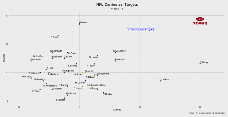 This graph simply reinforces the elite level of passing volume that Najee Harris has seen so far this season.