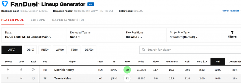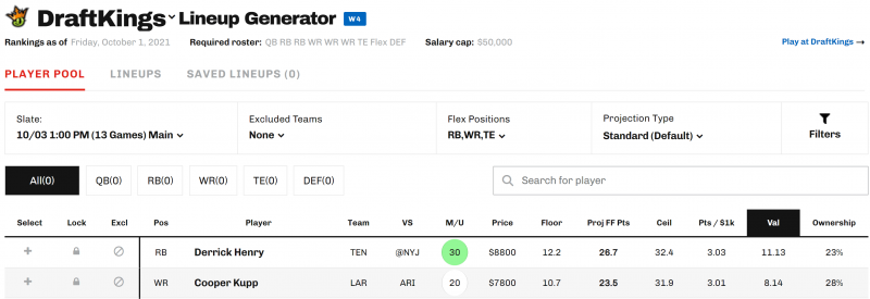 I mentioned Cooper Kupp as a lock play because he's just been that good to start the season. One way to approach wide receiver is to surround Kupp with cheap value options like the aforementioned Jaylen Waddle and Nick Westbook-Ikhine ($3,200). With Julio Jones leaving the game last week, Westbrook-Ikhine received four targets and posted 54 yards and a touchdown. That's not all that enticing but Jones and A.J. Brown are both battling injuries and are uncertain to play this week.