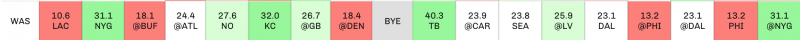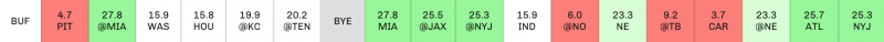 Also, by looking at strength of schedule we can pinpoint bye week fill-ins to target via the waiver wire or trade. Some examples of players with great upcoming schedules are Zack Moss and Curtis Samuel, whose return is imminent after a groin injury. Moss has a bye in Week 7, then gets three straight contests against teams ranked 31st, 29th and 30th, respectively, in aFPA. As an added bonus, Moss’s fantasy playoff schedule is pretty sweet with a Week 16 tilt against New England (26th), followed by the 28th-ranked Falcons in Week 17.