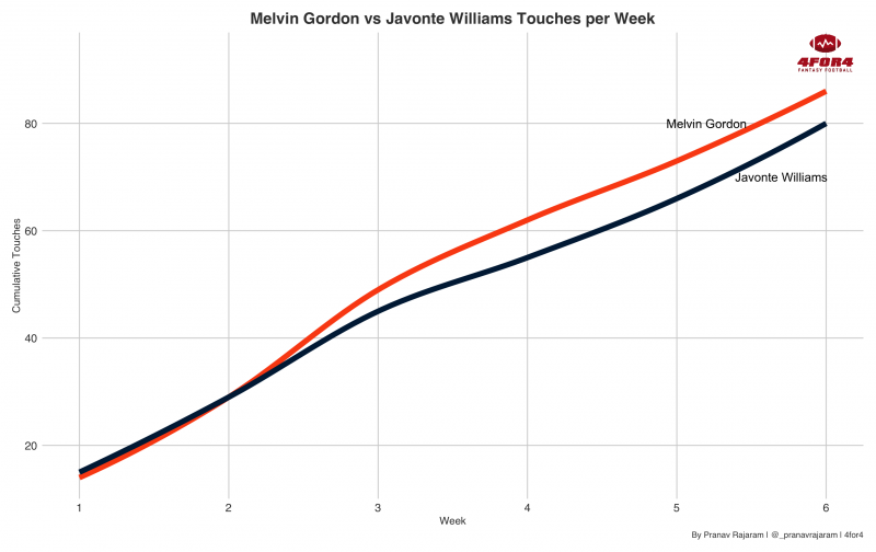 In this graph, we can see that Williams and Melvin Gordon have essentially had a 50/50 split in the Denver backfield, leading to Williams’ limited upside.