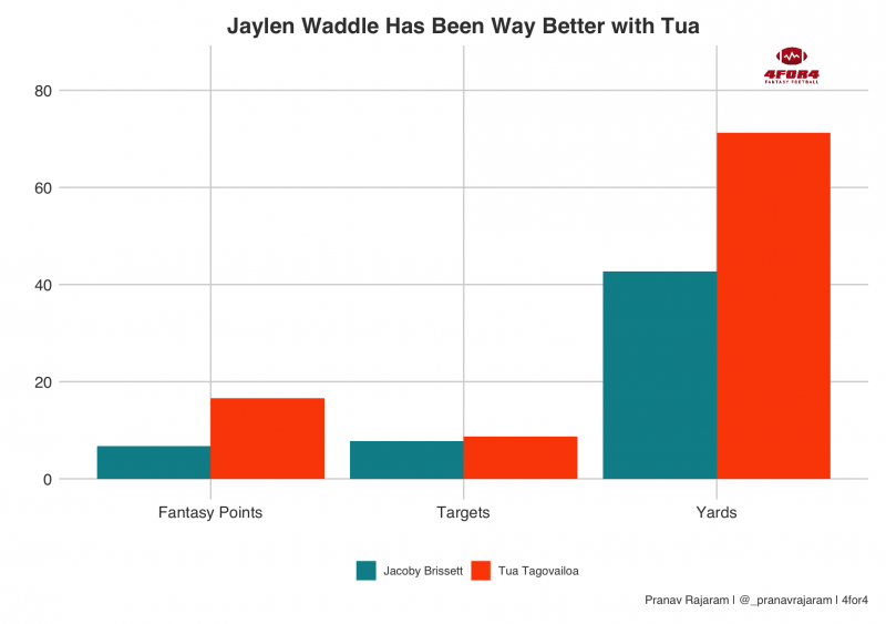 Quarterback play has been crucial for Waddle: We can see that he has been significantly better with Tua Tagovailoa under center this season—Waddle is the overall WR8 in the weeks with Tua, and WR60 with Jacoby Brissett. With his former Alabama QB now back from injury, you can safely start Waddle as a FLEX. He gets a big boost in PPR leagues as well.