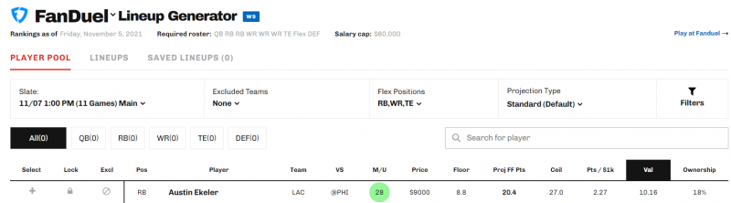 In this article, we walk through the process of constructing an optimal lineup that will dominate your cash games on the main slate of Week 9. We start with the optimal lineups for FanDuel and DraftKings determined by the Lineup Generator. Then, we identify the players that are irreplaceable and should be locked into your lineup. For the remaining players, we discuss the main alternatives that you can swap in to make a winning team that best fits your own style.