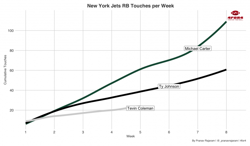 Here, we can see that Carter has increased his touches nearly every week and has emerged as the top dog in the Jets' backfield. Pair this with Mike White feeding the running backs in the passing game, and Carter is worth a pickup in most fantasy leagues. I’d spend about 15% of a FAAB budget on him.