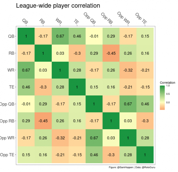 Consider league-wide correlation numbers from the games that we typically target the most for GPPs, potentially high-scoring games. Using the 4for4 DFS Correlation Tool, filtering for games with an over/under of at least 50 and teams that are favored by three or more on FanDuel, we see that running backs actually correlate more with the opposing passing game than quarterbacks.