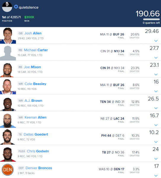 This week’s winning lineup had an average ownership of 12.7%, the second-highest average of any winner this year. The most unique players in the lineup were running back Michael Carter and tight end Pat Friermuth.