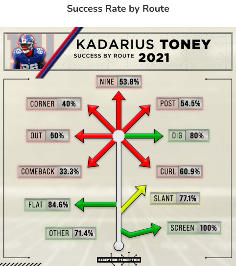 As you can see from the graphic above, Toney struggled mightily running routes. Reception Perception paints his route-running skills as pretty much non-existent. This means he needs to use his athleticism and depend on quality coaching to scheme him open. That can become a dangerous place to make your living because at some point, you have to beat the man across from you—Toney didn’t show he could do that consistently last season. Matt Harmon of Reception Perception had this to say about Toney's rookie season: