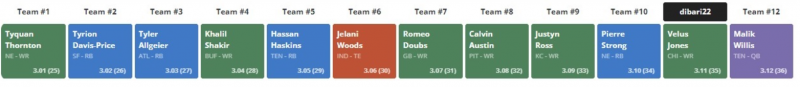 Things got gross quick, didn't they? As much as I said I liked drafting at the end of round one, I equally dislike being at the end of round three. There are quite a few intriguing players in the early-to-mid-third, and none of them fell to me. So, looking at who was available when I was on the clock, I selected the player who I believed to have the least competition ahead of him on his depth chart: The Bears' Velus Jones. Jones is arguably the Bears WR2 before the team even plays a game this season, and there isn't anyone else remaining in the draft who can boast of being in as good of a situation. I don't love the pick, but I made the most out of what I could with pick 35.