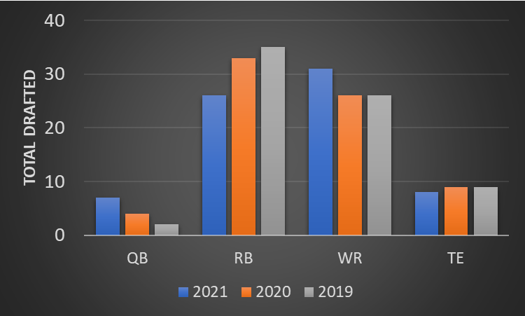 From the 2021 data alone, a balanced approach was optimal. Ten of the 12 builds allocated picks to at least three of the four positions typically considered by the sixth round. Just two strategies featured more than half of the selections assigned to one position. It makes methods like ‘ZeroRB’ or ‘HeroRB’ harder to justify, but how often drafters employ the strategy is key here. Regardless, there’s another trend at play.