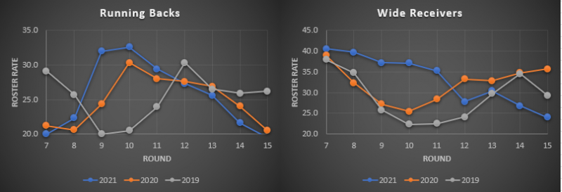 - The roster rate for running backs in the ninth and 10th has increased from 20.0% in 2019 to 32.6% in 2021. Wide receivers have seen a similar increase (22.3% to 37.1%). As a result, target players in ambiguous situations with a path to a more significant role.