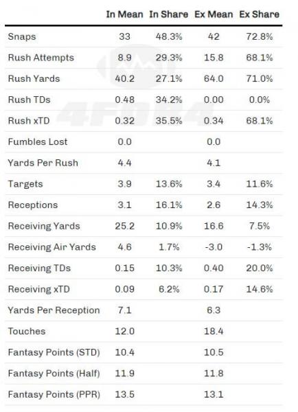 Using 4for4’s Market Share Splits App, let’s take a closer look at Hunt’s production while sharing time with Chubb versus Chubb missing the game: