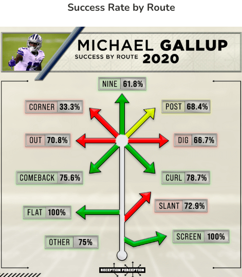 "It doesn’t get brought up nearly enough that Gallup plays the most difficult receiver role in the Cowboys’ offense. Since he’s their best receiver against press coverage, right now, Gallup is the only one who can consistently play the X-receiver position. Gallup lined up outside on 95 percent of his sampled snaps and was on the line for 78.4 percent. Gallup also runs the most difficult routes on the tree at a high rate. Given that he thrives in this difficult role and a player like Cooper is best suited in positions other than X-receiver, it’s hard to argue with the Cowboys continuing to lean on Gallup here. Gallup’s 72 percent success rate vs. man coverage demonstrates he’s an underrated route runner. With a 75.5 percent success rate vs. press coverage, we see he’s developing a wide variety of release moves that give him an edge when running vertical patterns. Gallup’s best work comes on the curls and comebacks. He leads all players charted from 2020 in comeback routes by a decent margin and maintained a strong 75.6 percent success rate. These routes can be the basis of any NFL receiver’s portfolio but it’s far from some of the layup targets other players in the receiver corps get on a regular basis."